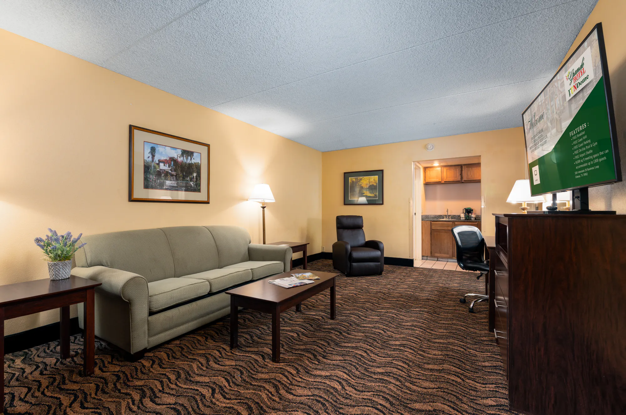 Read MoreLocated in Odessa; The MCM Grande Hotel is your accommodation choice for your next business, family, or leisure trip. Experience -well appointed guest rooms -on site dining options -24hr reception -24hr access to gym and business center -free parking and complimentary high-speed wireless internet. Our hotel is only a quick journey from Midland International Airport (MAF).